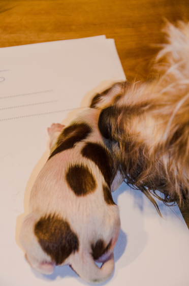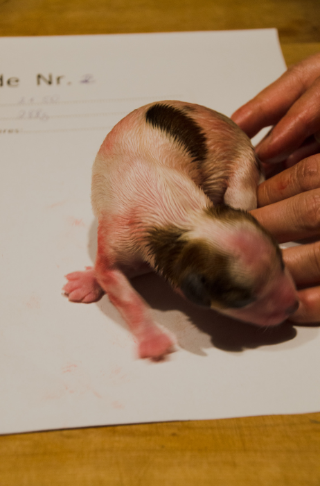 Direkt nach dem Wurf, und vor dem Umzug von der Wurfschale in die Wufbox, sieht Ely noch etwas mitgenommen aus, aber er hat alles prima verkraftet.